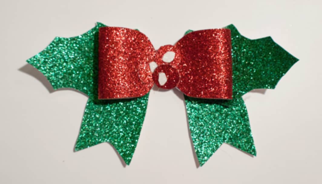 Holly berries are an essential part of every Christmas season celebration. This bow features holly berries and holly leaves together to make a festive bow. You can use it to make a hair bow or scale up the size and use it to decorate a Christmas wreath.